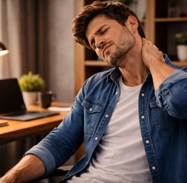"Visual: ultra realistic, cinematic lighting, depth of field, natural motion, 4K quality. Close-up neck overlay showing inflamed muscles (red glow). Character touching neck with concern. The character is NOT speaking."