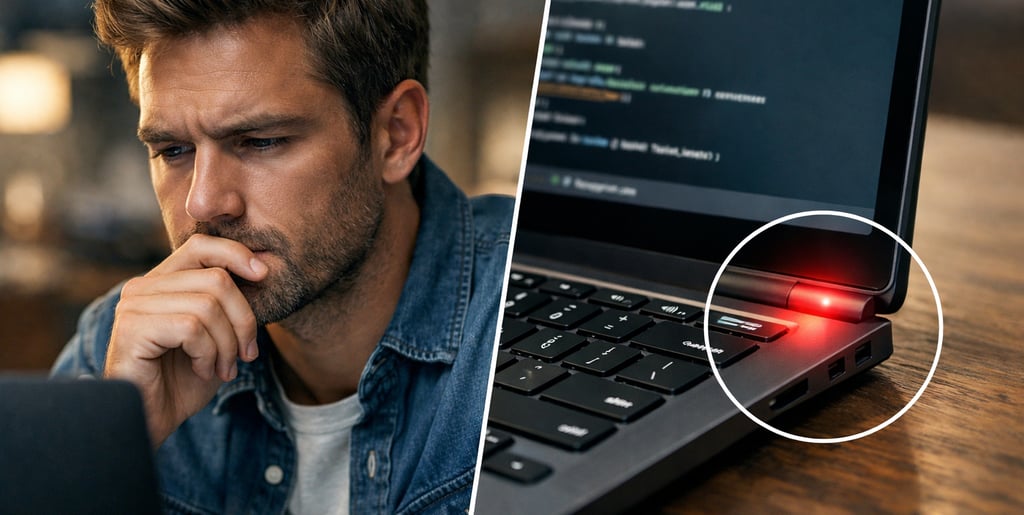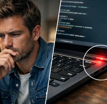 "Visual: ultra realistic, cinematic lighting, depth of field, natural motion, 4K quality. Same character looking at laptop thoughtfully. Split overlay showing laptop design (screen + keyboard attached). Slight highlight on problem area. The character is NOT speaking."