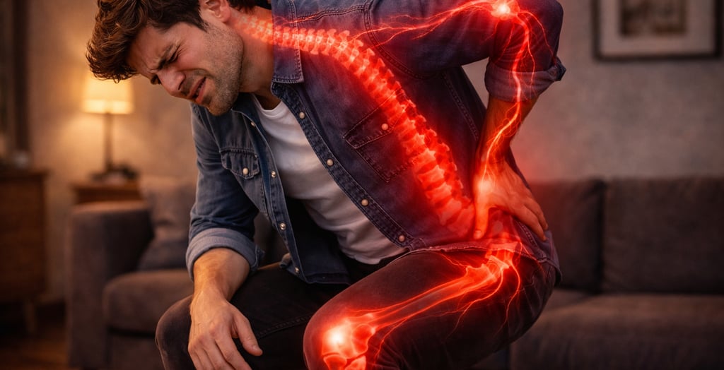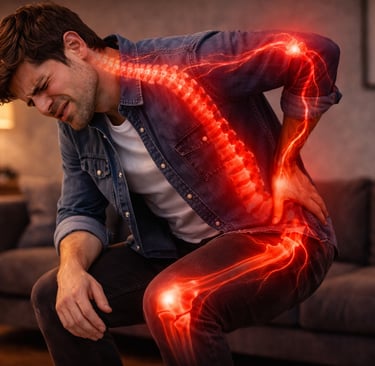 "Visual: ultra realistic, cinematic lighting, depth of field, natural motion, 4K quality. Medical overlays highlighting spine, knee, and nerve areas in red. Character showing discomfort. The character is NOT speaking."